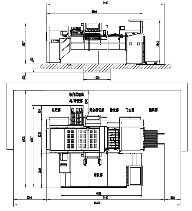 | 整機(jī)尺寸 | 7100×5017×2643mm(L×W×H) (長(zhǎng)含預(yù)上紙軌道;寬含腳踏板) |