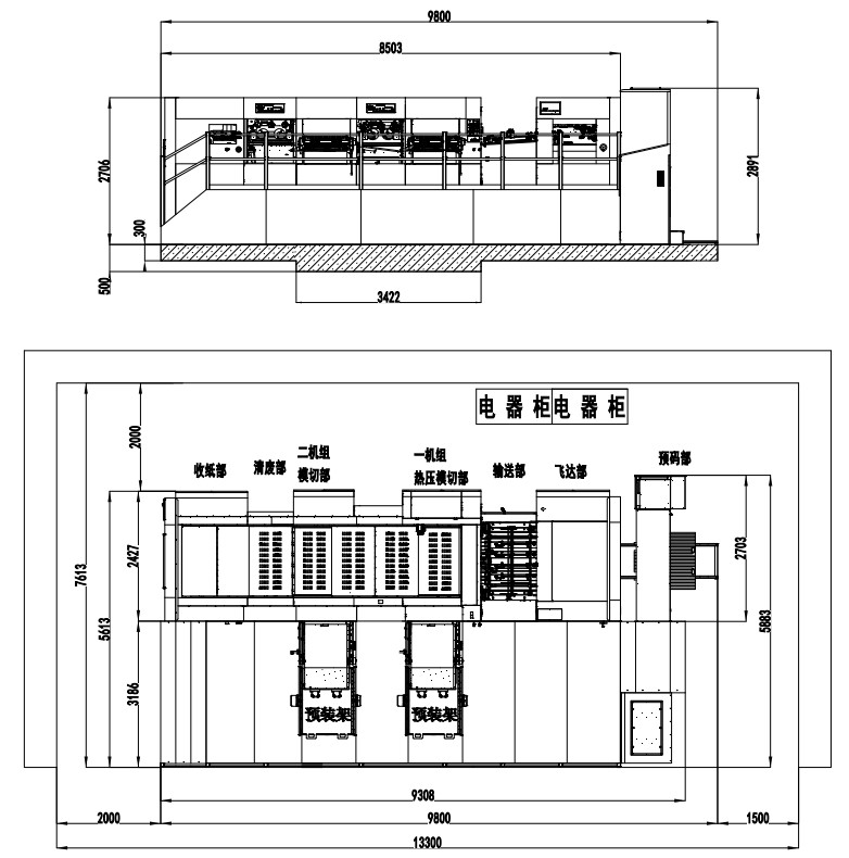 | Machine Dimensions (Including Die Preloader) | 9800×7613×2891mm(L×W×H) (L: paper prepared track included, W: platform included) |